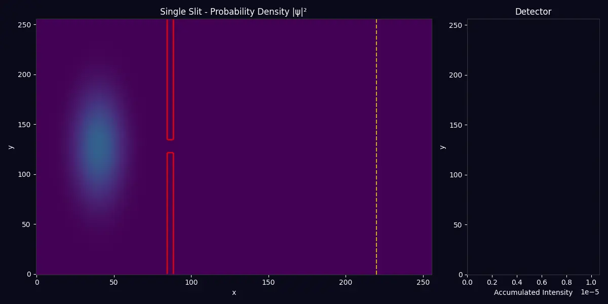 The video above shows the wavepacket evolution in real-time, demonstrating how the probability density evolves as the quantum particle passes through the slit.